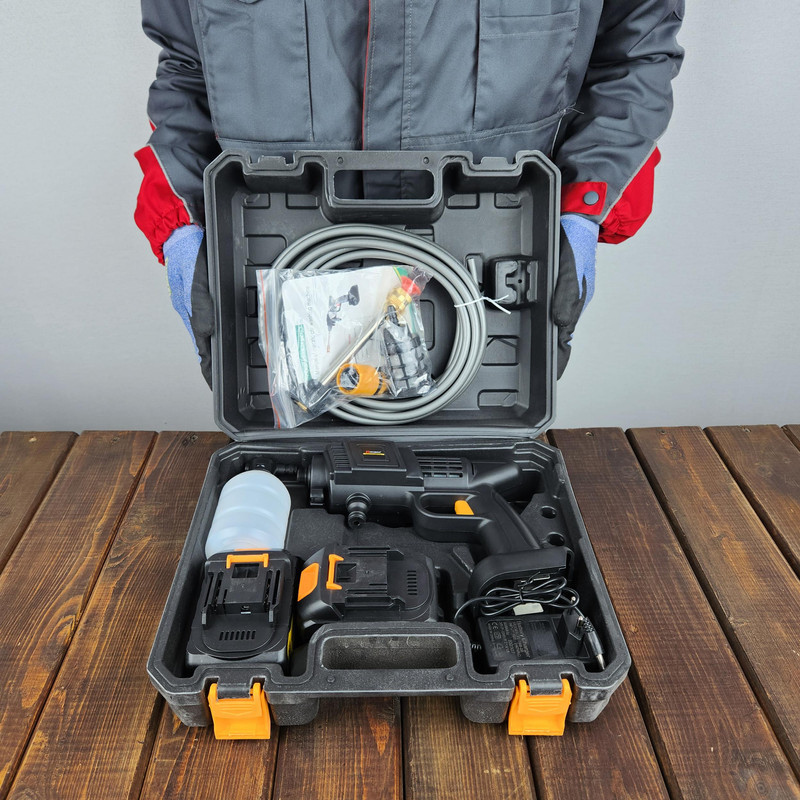 کیف حمل، گان بلند، شلنگ ورودی و یک عدد اتصالات ورودی و فیلتر و دو عدد سری تنظیم پهنای پخش آب (تبدیل قرمز و سفید)