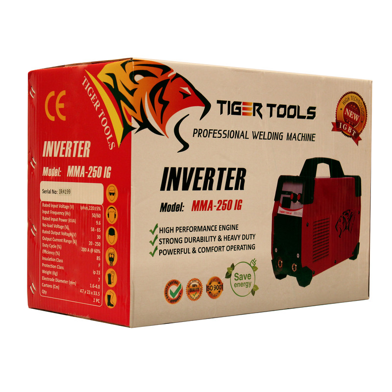 دستگاه جوش 250 آمپر مدل 250 IG یکی از تولیدات تایگر تولز میباشد که توانایی کارکردن با الکترود 1.6 تا 4 را به صورت مدام و الکترود 5 را به صورت مقطعی دارد و قابلیت برشکاری میلگرد و رابیتش کاری را دارا میباشد.این دستگاه قابلیت کار کرد با تمامی الکترود های چدن,آهن , استیل را دارد.