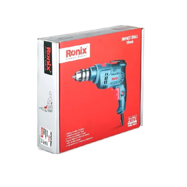 معرفی دریل چکشی رونیکس مدل 2121 دریل رونیکس مدل 2121 با وزن 1.4 کیلوگرم و توان موتور 450 وات دارای قابلیت سوراخکاری چکشی میباشد و سرعت این موتور در حالت بیباری بین 0 تا 3200 دور در دقیقه است. این دریل برقی دارای سه نظام آچاری 10 میلیمتر است. از دیگر ویژگیهای دریل چکشی رونیکس مدل 2121 میتوان به کلید الکترونیک دیمردار، کلید الکترونیک چپگرد و راستگرد ضد غبار مطابق با استاندارد TUV، آرمیچر و بالشتکهای صنعتی با بالاترین کیفیت سیم پیچی مطابق با استاندارد CE، کلید قفل کن در وضعیت روشن، گیره بر روی بدنه جهت کاربری در ارتفاع، طراحی جدید و ارگونومیک بدنه جهت سهولت در کاربری اشاره کرد.