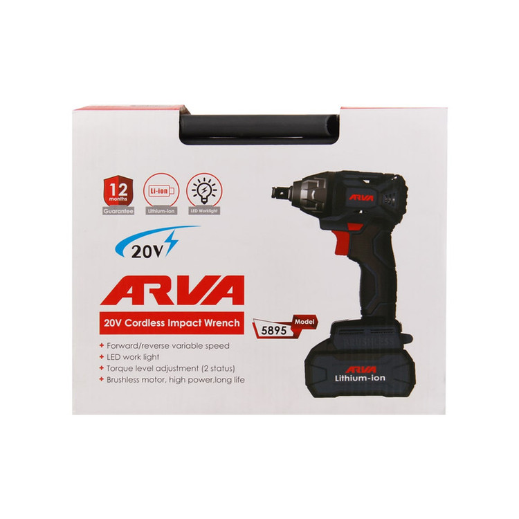 آچار بکس شارژی آروا مدل 5895 دارای موتور براشلس با ولتاژ 20 ولت که عملکرد کاملی را برای باز کردن یا بستن پیچ و مهره در اختیار شما قرار می دهد. از ویژگی های مهم این آچار بکس می توان به سرعت در حالت آزاد 2100 دور در دقیقه و 2500 دور در دقیقه را نام برد. لازم به ذکر است حداکثر گشتاور این دستگاه 250 تا 300 نیوتون بر متر و سرعت ضربه 3200 ضربه در دقیقه است. آچار بکس آروا مدل 5895 دارای 2 عدد باتری 20 ولت لیتیوم - یونی با ظرفیت 4 آمپر ساعت ، شارژر باتری و کیف همراه می باشد.