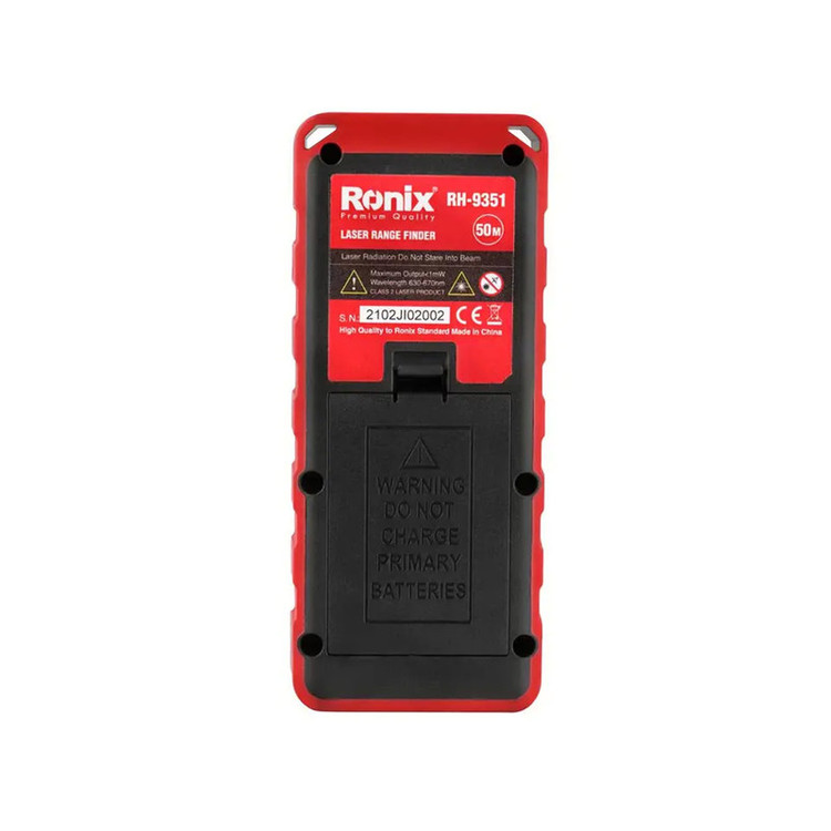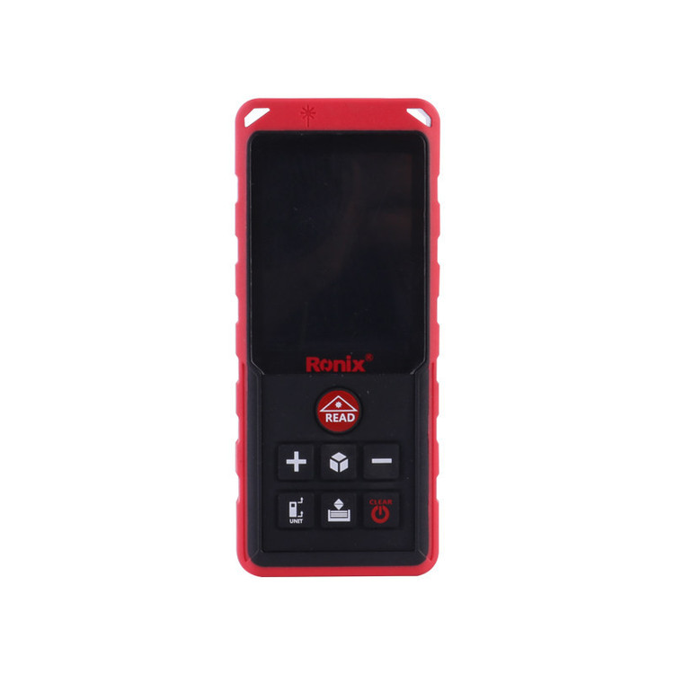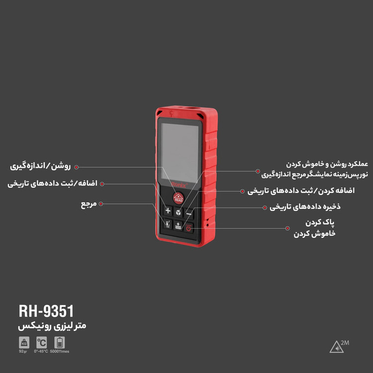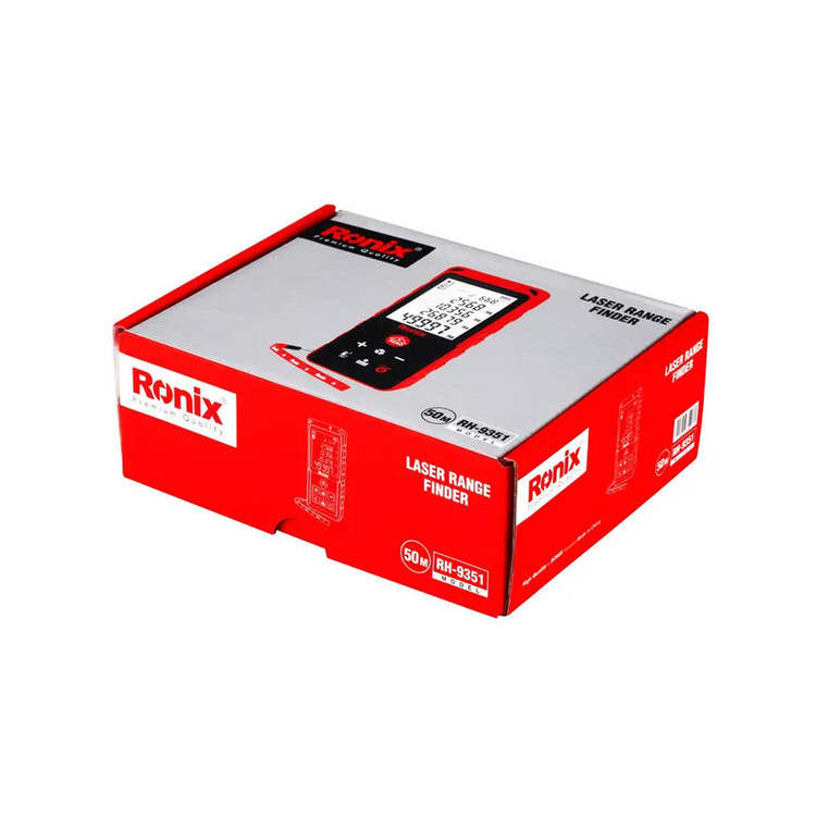 متر لیزری رونیکس مدل 9351RH یک متر با قابلیت های عملکرد اندازه گیری به تمامی واحد های اندازه گیری بر اساس متر، فوت و اینچ و قابلیت تبدیل تمامی واحد های اندازه گیری به یکدیگر نیز می باشد. این متر مجهز به صفحه کلید روان با عمر و کارکرد مستمر است. این دستگاه دارای قابلیت اندازه گیری مستمر و دلخواه جهت محاسبه جابجایی را دارد همچنین انجام عملیات کاربردی تکمیلی اندازه گیری ماند مشخص کردن حد اقل و حداکثر، قابلیت جمع و تفریق محاسبه ی مساحت، اندازه گیری حجم و محاسبه ارتفاع با کمک فرمول فیثاغورث است. سرعت اندازه گیری و دقت این محصول بسیار بالا بوده که باعث ایجاد سهولت در حین کار می شود. این دستگاه با منبع تغذیه باطری کار می کند و وزن آن با باطری به 92 گرم می رسد و دارای استاندارد های لازم اروپا و شرکت رونیکس می باشد . متر های لیزری در اندازه گیری زمین ها ، ساخت و ساز های شهری، دکوراسیون، نصب و … مورد استفاده قرار می گیرد. این متر ها با توانایی هایی که دارند نظیر اندازه گیری دقیق و سریع و با سرعت انتقال و سهولت کاربری همچنین اندازه گیری شیب، طول، حجم و ارتفاع می توانند تاثیر بسزایی در بهبود و سرعت عملکرد پروژه های مختلف داشته باشند. این محصول در محاسبات عمرانی، دکوراسیون و نصب کارایی بسزایی دارد. جهت جلوگیری از آسیب های احتمالی یک کیف برزنتی طراحی شده و همچنین یک بند آویز برای ایمنی دستگاه هنگام استفاده همراه با آن عرضه می شود.