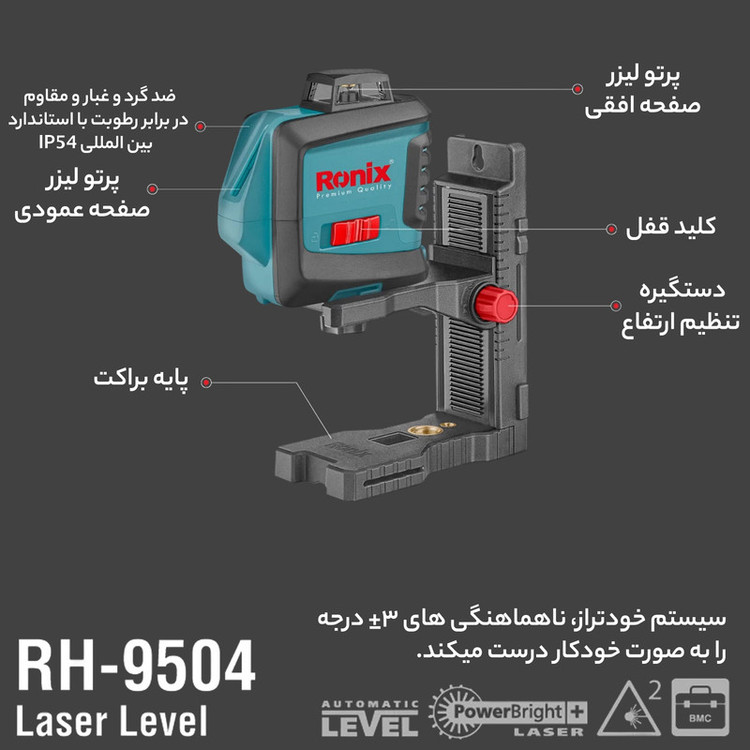باتری , دارای سیستم تراز خودکار , قابلیت نصب روی پایه , قابلیت نمایش خط , قفل تراز , نمایش خط لیزر افقی , نمایش خط لیزر عمودی