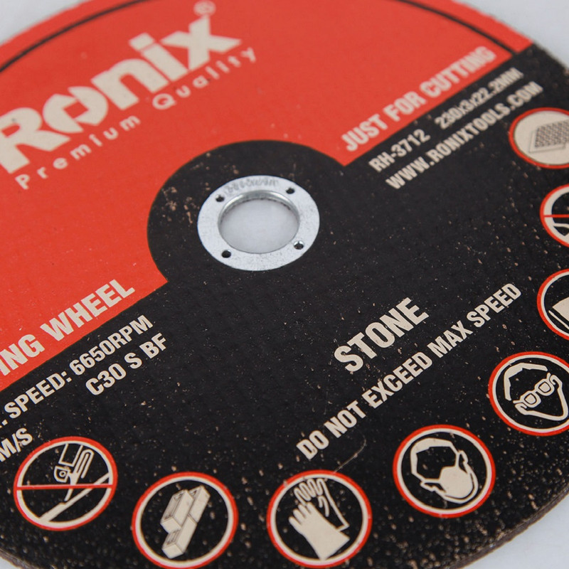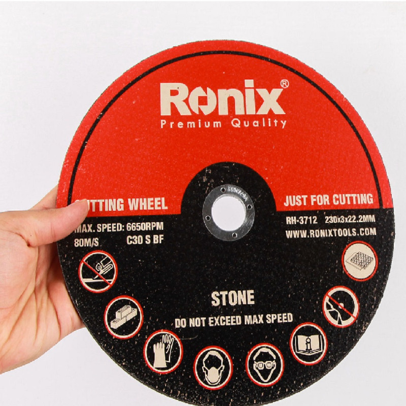 صفحه سنگها عمدتا جهت برش و یا سایش آهن آلات، استیل و یا سنگهای غیر گرانیتی استفاده میشود. رونیکس دارای کاملترین مجموعه صفحه سنگهای برش و سایش در سایزهای مختلف است.« صفحه سنگ برش مدل 3712در سایز 23 سانت جهت برش سنگهای غیر گرانیتی وموزاییک ونیز بتون عرضه میشود. این صفحه سنگ از دو لایه توری فایبرگلاس مستحکم صنعتی و سه لایه رزین صنعتی ساخته شده است تا مقاومت و استحکام صفحه سنگ به حداکثر برسد. این صفحه سنگ دارای دو پولکی فلزی جهت راحتی نصب بر روی دستگاه است. این صفحه سنگ محصولی است که مطابق با استاندارد MPA آلمان و نیز استاندارد EN12413 ساخته شده است. حداکثر دور در دقیقه جهت استفاده از این صفحه سنگ 6650 دور در دقیقه بوده. به دلیل بافت مخصوص و جنس خاص دانه بندی رزینهای موجود در این صفحه سنگ، عمر و نیز سرعت برش (پیشروی) این صفحه سنگ به حداکثر رسیده است. همواره باید صفحه سنگها بر اساس نوع قطعه کار استفاده شود. به هیچ عنوان نباید با صفحه سنگ برش جهت سایش (ساب) استفاده نمود و بالعکس. استفاده غیر اصولی و عدم منطبق با قطعه کار ممکن است باعث صدمات جدی به کاربر شود.