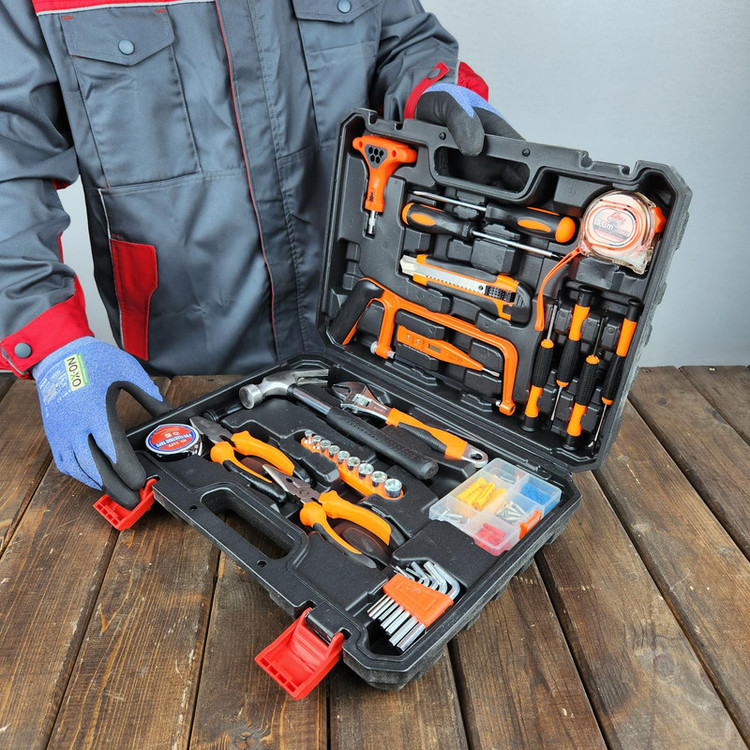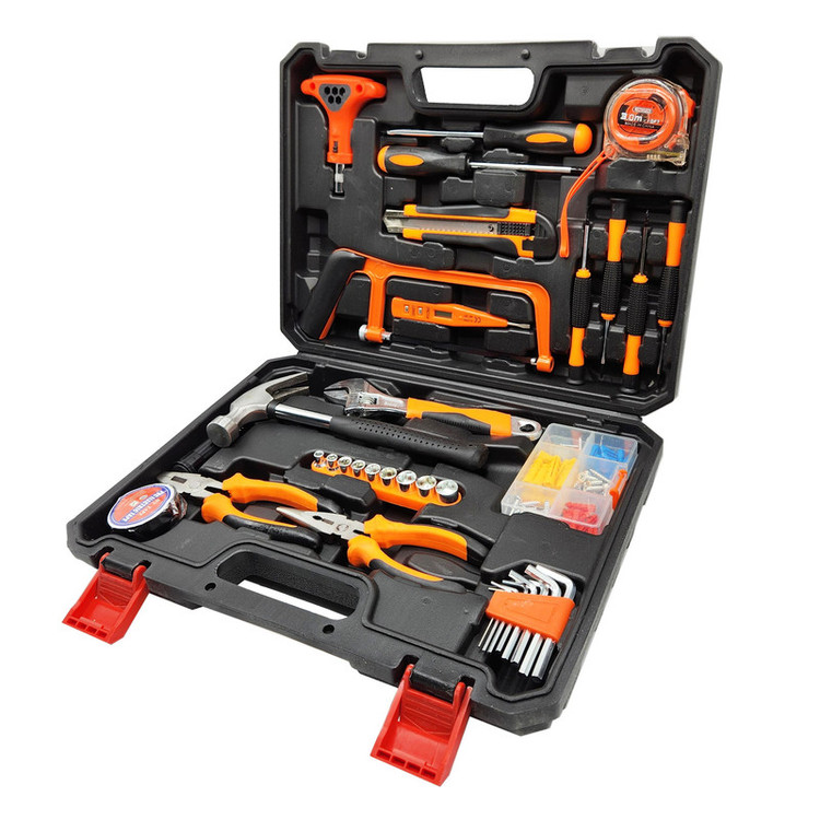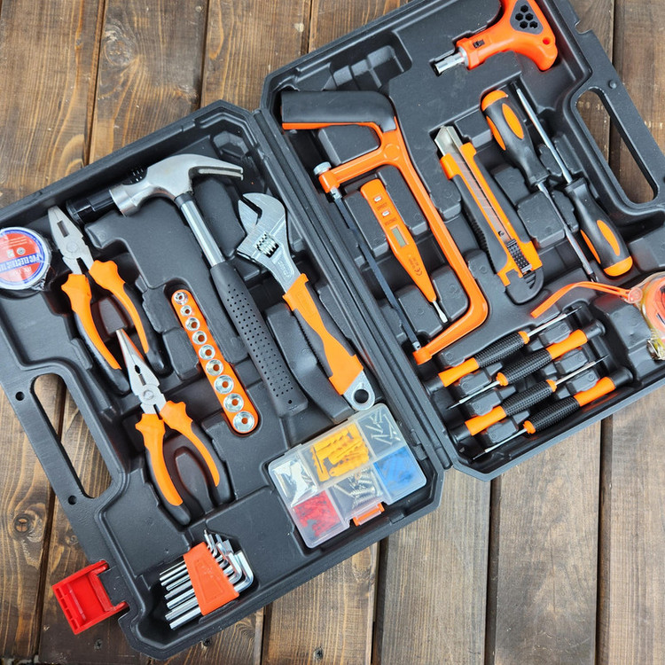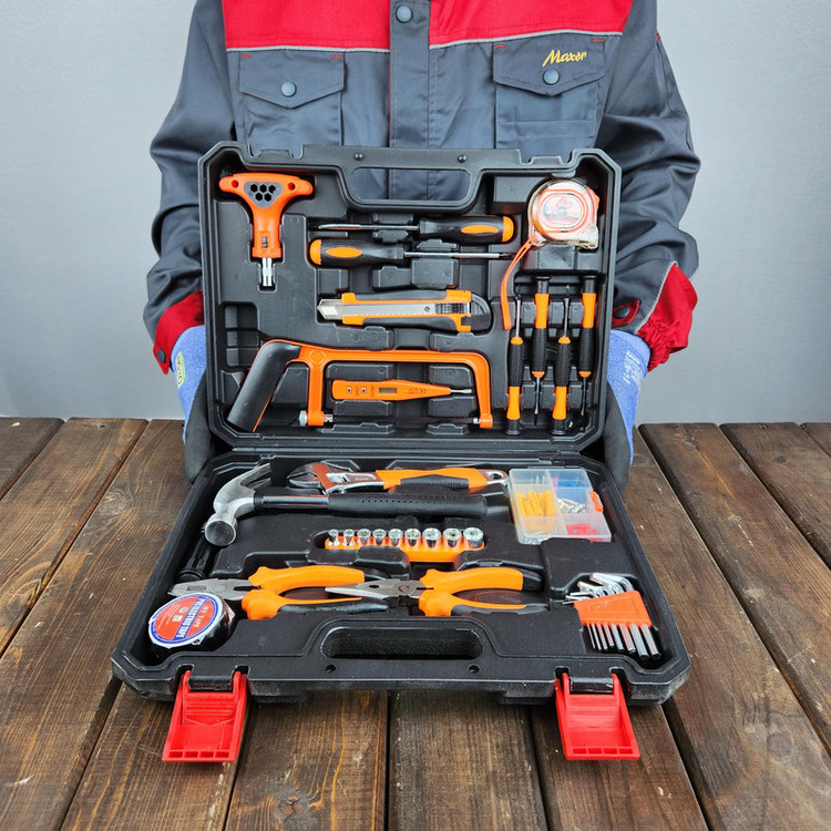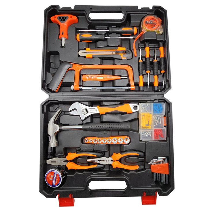 محتویات مجموعه: آچار بکس , آچار فرانسه , انبر دم باریک , انبردست , پیچ گوشتی , چسب , متر , مته