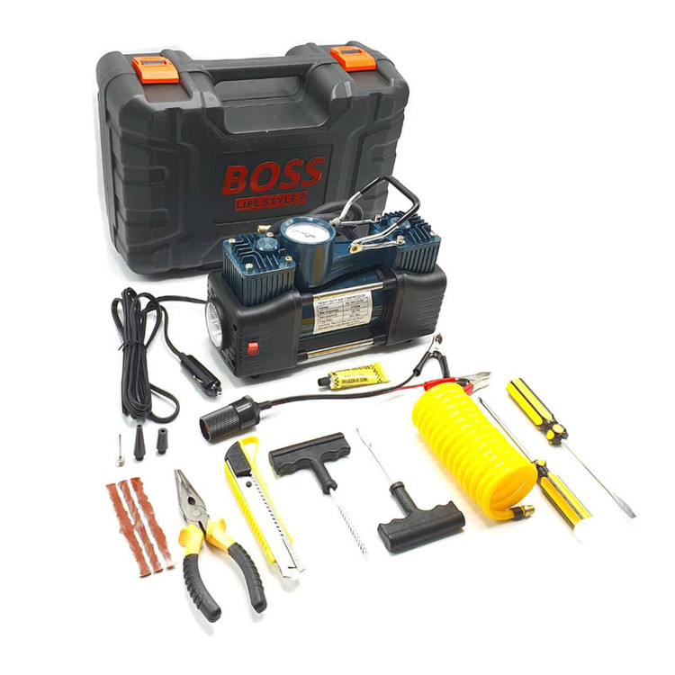 کمپرسور فندکی 12 ولت 800 وات باس BOSS کمپرسور فندکی BOSS یکی از وسایل و ابزارهای پرکاربرد جهت تعمیرات سرپایی ماشین می باشد که به طور کلی برای هر نوع وسیله نقلیه یک وسیله ضروری محسوب می شود. کمپرسور فندکی باس دارای انواع مختلفی است از این رو با توجه به ویژگی های مناسبی که دارد جهت تعمیر ماشین و تولید باد به میزان مناسب قابل استفاده است. کاربرد کمپرسور فندکی باس کمپرسورهای فندکی BOSS جهت تولید باد با میزان قدرت متفاوتی هستند که قابلیت های کاربردی آنها را با تنوع مناسبی همراه می سازد. کمپرسورهای فندکی قابلیت اتصال به باتری ماشین را دارند از این رو در انواع اتومبیل قابل استفاده می باشند. با استفاده از کمپرسورهای فندکی می توان هر نوع پنچری و یا کم بادی که در لاستیک ماشین پدید آمده است را رفع کرد. این کمپرسور فندکی دوکاره هست و علاوه بر فندکی خوردو مجهز به انبر جهت اتصال به سرباتری خودرو می باشد از این رو جهت استفاده از انواع کمپرسو.رهای فندکی در موقعیت های مختلف جای نگرانی نیست. بدنه مناسب و قدرت بالایی که برای کمپرسورها وجود دارد می تواند سرعت باد کردن لاستیک را به میزان زیادی افزایش دهد از این رو در وقت و هزینه صرفه جویی می شود. همچنین این کمپرسور دارای اجزای دیگر و نیز چراغ قوه می باشد که در توضیحات به آن اشاره شده است